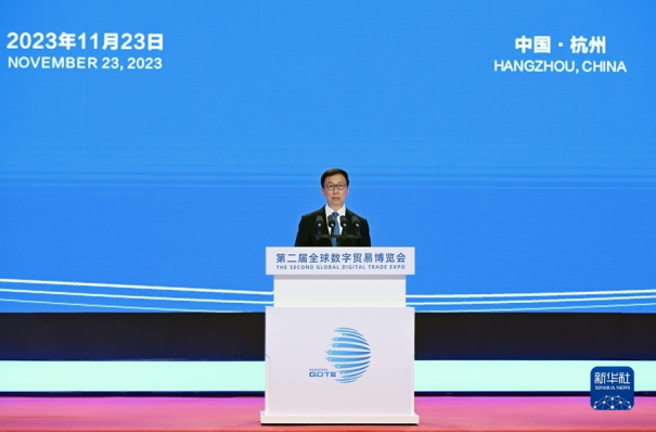 新华社杭州11月23日电(记者韩洁、张璇)国家副主席韩正23日在浙江杭州出席第二届全球数字贸易博览会开幕式,宣读习近平主席贺信并致辞。